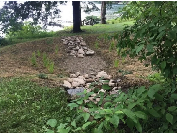 Implementation of a regenerative stormwater conveyance downstream of a stormwater outfall in a steep setting along Lake St. Catherine.